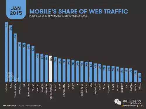 移动网络自从去年以来,移动网络占全球网站流量份额跃居到39%,超过1/3网站的网页现在可通过手机浏览。可是,移动网络所占网站流量份额在全球分部也十分不均。在巴布亚新几内亚,手机可浏览89%的网页。而在更小的加勒比群岛,手机只能浏览0.1%的网页。值得注意的是,印度人使用手机上网者激增,移动网络在网站流量中占主导地位。这个全球人口第二多的大国,72%的网站可通过手机浏览。