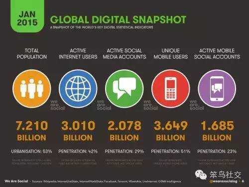 过去12个月的惊人增长在2014年,数字世界取得了一些令人瞩目的里程碑:1.2014年8月份,全球社交媒体用户超过20亿人;2.2014年9月份,全球手机渗透率超过50%;3.2014年11月初,全球互联网用户超过30亿人;4.2014年12月份,全球活跃手机数量超过人口总数;5.研究机构We are social的报告中显示,这些增长趋势没有减缓迹象。