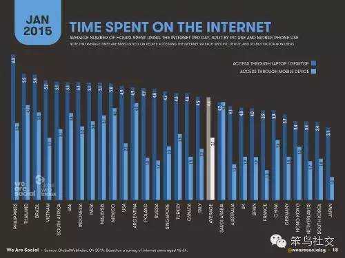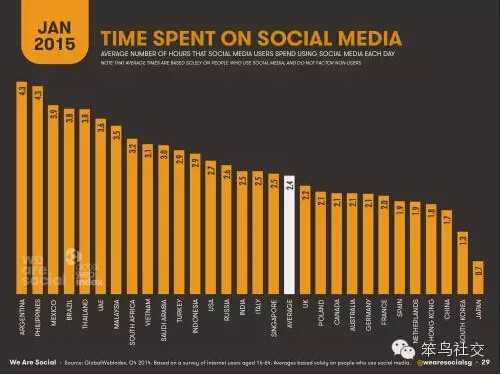 与此同时,GlobalWebIndex的研究显示,社交媒体用户每天使用社交网络和微博的平均时间为2小时25分。其中,阿根廷和菲律宾用户使用社交媒体时间最长,每天超过4小时。