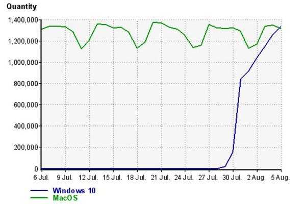 统计图表显示,Windows10的市场份额呈现十分典型的火箭式攀升。