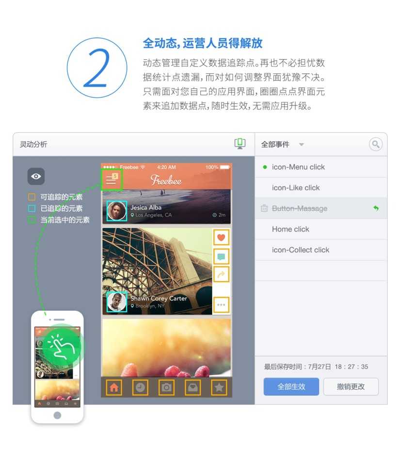 日前,TalkingData正式对外公布了其下一代移动应用统计分析系统——灵动分析。对比此前的各种移动应用统计分析产品,灵动分析的最大特点是大幅简化了数据集成过程,只需在App中加入分析SDK,无需再编写任何代码和更新App版本,即可实现事件跟踪、增删数据点等操作,做到完全零代码数据跟踪。这极大的简化了研发人员工作,同时也能让产品和数据分析人员任何的天马行空数据需求瞬间得到满足,大幅提高运营效率。