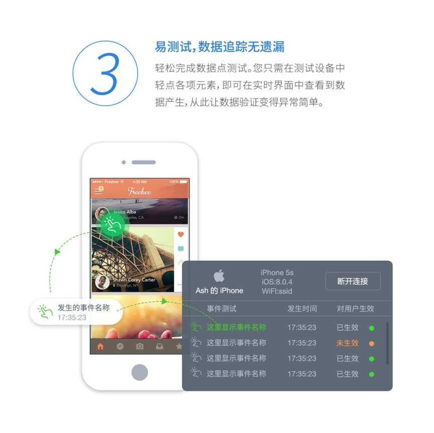 动态管理数据点的同时,灵动分析也带来了可视化的数据测试,这让数据准确性和验证数据需求吻合度上都得到极大提升,轻点每个界面元素,即可实时查看到动态数据日志,哪怕是几秒前新定制的追踪点全部适用。