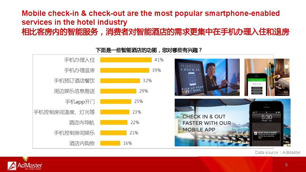 智能化近年来成为各行业热议的话题,智能酒店也被酒店业人士所普遍关注。 AdMaster调研发现,用户对智能酒店的需求集中在手机办理入住(41%)和退房(39%)方面。还有32%的用户对于用手机预订酒店内的餐饮服务也感兴趣。
