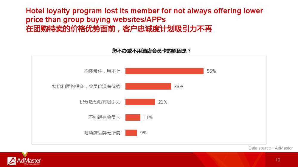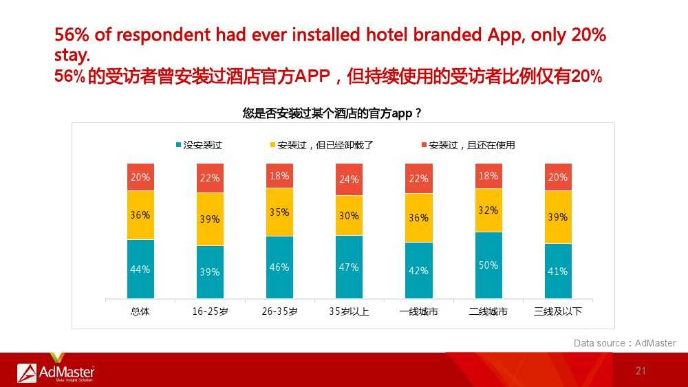 尽管不少酒店都在大力推广官方App,但总体来看,酒店自有App的覆盖率还较低。AdMaster发现,56%的被访者曾下载过酒店官方App,而36%在安装之后又卸载了。酒店官方App如何吸引新用户下载安装、如何为用户提供良好体验、如何成为客户忠诚度计划的移动平台,是酒店业营销者需要思考的问题。