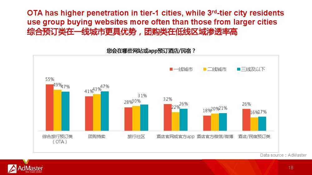 具体来看酒店预订的在线渠道,OTA领跑,团购特卖网站紧随其后。一些旅行社区在向电商化、平台化转型后,也吸引了一部分旅行者。相比之下,酒店的自有渠道(包括官网、官方App、官方微信等)在旅行者中影响力则较为有限。
