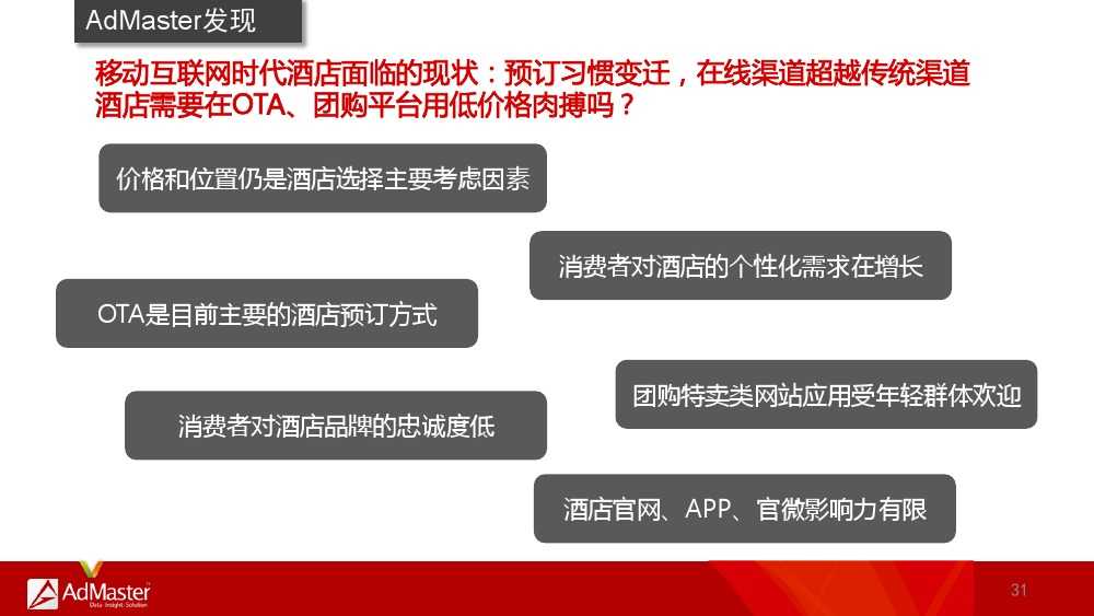 AdMaster发布了一份《酒店行业消费洞察与营销趋势报告》,报告针对酒店消费需求、酒店预订行为、酒店业营销等几方面进行了研究和分析,用消费者洞察数据和酒店营销案例,呈现当前酒店消费特征和酒店业营销的发展趋势。该报告的重点发现包括: