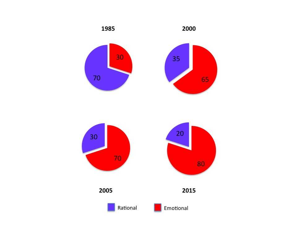 1985年刚刚出现“千禧一代”这个称呼,那时消费决策过程更加理性,理性比感性的比例是70:30。这意味着理性价值决定价格、商品质量、分销点数量和广告,因此,理性更重要、更能促进销售。
