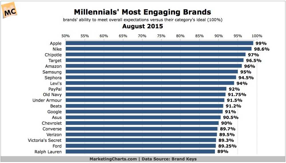 在品牌忠诚和参与方面,最能满足消费者感情价值期望的品牌往往排在消费者这个部类购物清单的首位。在调查的63个部类的顶尖品牌中,千禧一代忠实的品牌占91%。包括Apple, Nike, Chipotle 和 Old Navy。