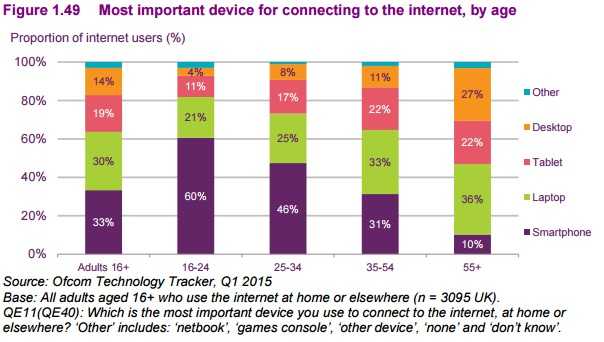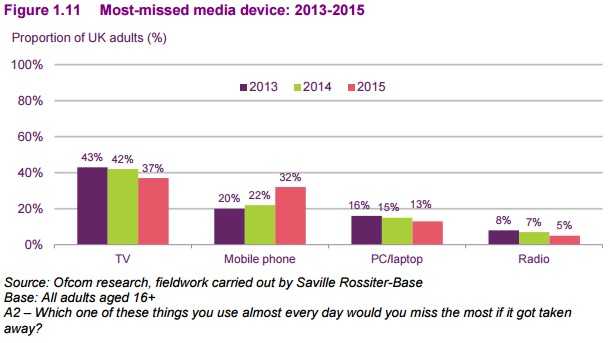 Ofcom的报告显示两年间智能手机已经成为成为成年人第二重要的设备。