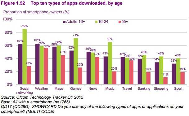正如预期的,社交网络和游戏是16到24岁用户最喜欢的功能,但是,有趣的是应用使用量排序,45%的受访者表示曾下载过银行应用,43%的受访者表示曾下载过购物应用。
