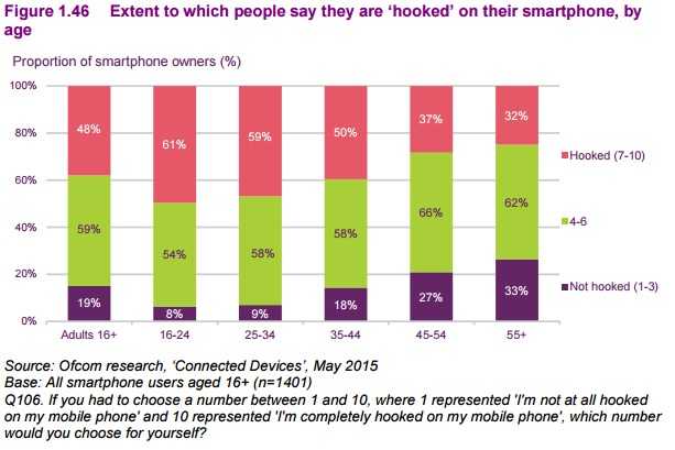约半数智能手机用户表示高度依恋(48%),而且迷恋程度随年龄增长而下降,3/5的16到24岁智能手机用户表示依恋自己的手机(61%);相比之下,55岁以上的用户只占32%。