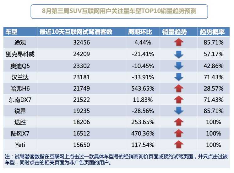 预测结果显示,SUV中途观、哈弗H6、东南DX7、途胜、陆风X7和Yeti本周销量上升,上升概率分别为85.71%、 28.57%、71.43%、100%、100%和100%;别克昂科威、奥迪Q5、汉兰达和锐界本周销量下降,下降概率分别 为57.17%、42.86%、71.43%和85.71%。