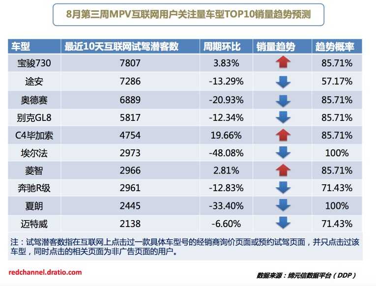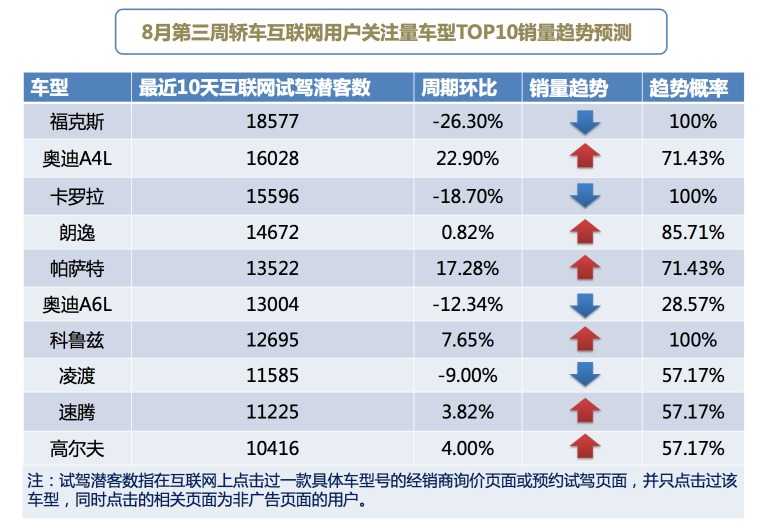 根据缔元信红渠汽车互联网营销数据库的试驾潜客数据,筛选出SUV、轿车和MPV下最近10天最受互联网购车 用户关注的车型,幵就这30款车型进行本周的销量趋势预测。