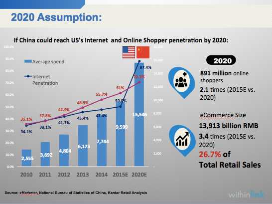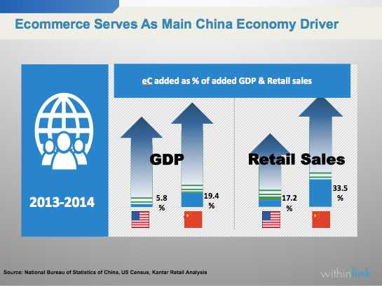 根据凯度零售咨询公司(Kantar Retail)的最新数据显示,中国已经以4580亿美元的销售额夺下了全球最大电子商务市场的桂冠,2014年电子商务贡献了中国GDP增长的19.4%和零售总额增长的33.5%。预测到2020年,中国网民将达到人口总额的80%,而他们中的70%将使用网上购物。
