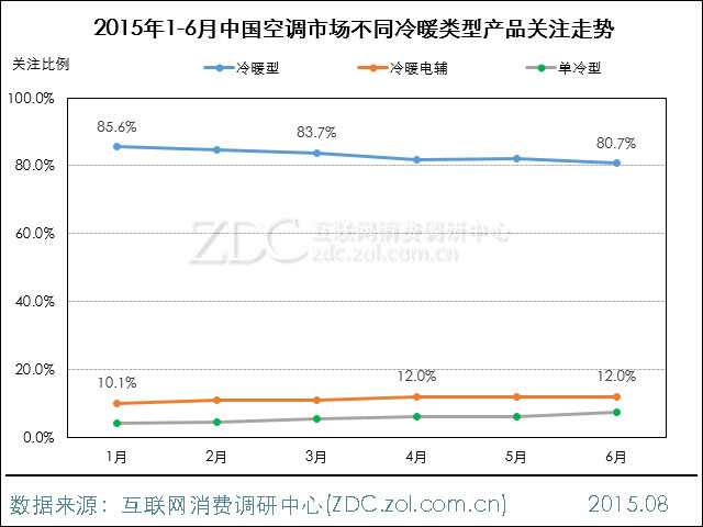从1-6月走势来看,用户关注主流的冷暖型空调呈缓慢的下降走势,6月获得80.7%的关注比例,较1月下降了近5个百分点。冷暖电辅与单冷型空调则受季节影响,关注度呈微幅上扬走势。