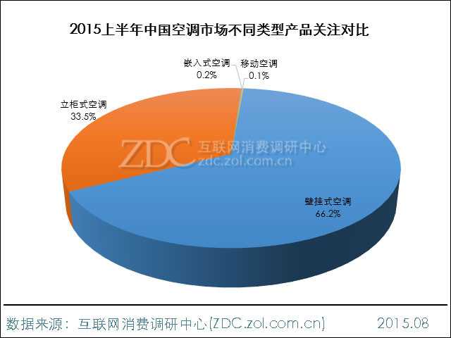 从空调类型来看,2015上半年壁挂式空调仍为用户关注的绝对重点,获得66.2%的关注比例,其次为立柜式空调,关注比例为33.5%。其他安装方式的空调仍为小众产品,关注比例均在0.5%以下。