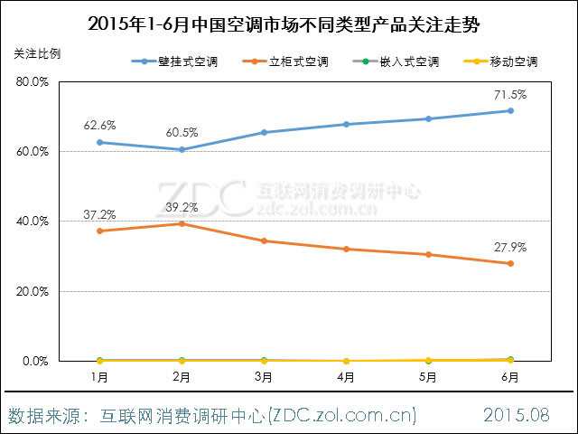 (图) 2015年1-6月中国空调市场不同类型产品关注比例走势