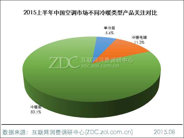 既能制冷又能取暖的空调目前来看,仍为用户关注的绝对主流,2015年上半年获得83.1%的关注比例,冷暖电辅型空调关注度超10%。单冷型空调关注度相对较低,仅为5.6%。
