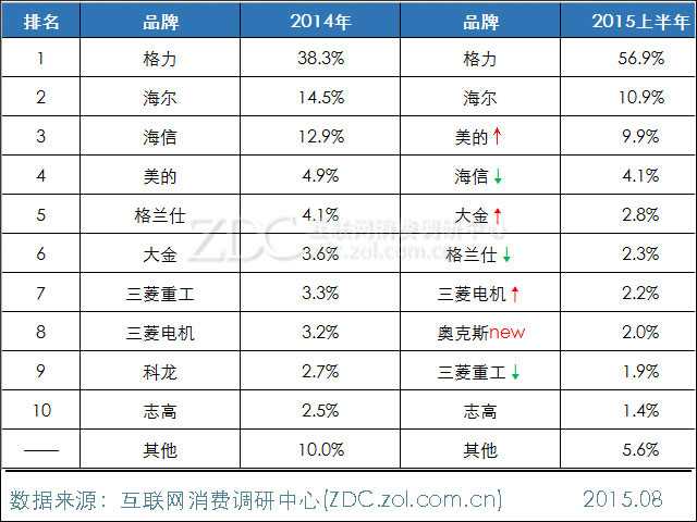 与2014年相比,2015年上半年中国空调市场品牌格局发生了大范围的变化,最受关注的十家品牌中七家排名波动,其中美的、大金、三菱电机排名升,奥克斯新晋跻身榜单第八位。海信、格兰仕、三菱重工则分别出现不同位次的下滑。