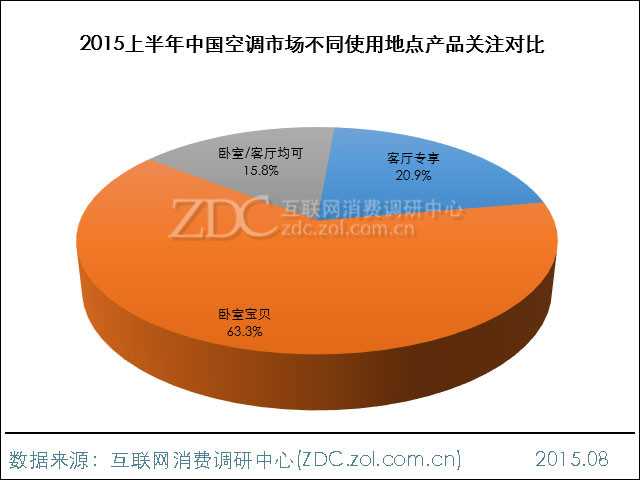 从不同摆放地点来看,卧室专用的空调用户关注度最为集中,获得63.3%的关注比例。客厅专享产品关注度超两成,为20.9%,而卧室/客厅均可使用的产品获得15.8%的关注比例,相对较低。整体来看,卧室产品为用户的主流需求。