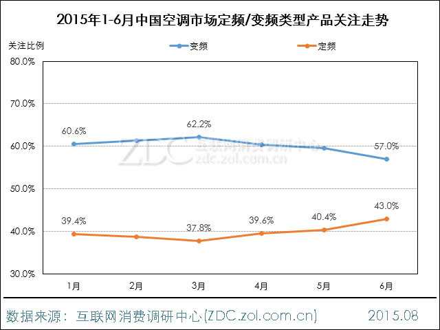 (图) 2015年1-6月中国空调市场定频/变频产品关注走势
