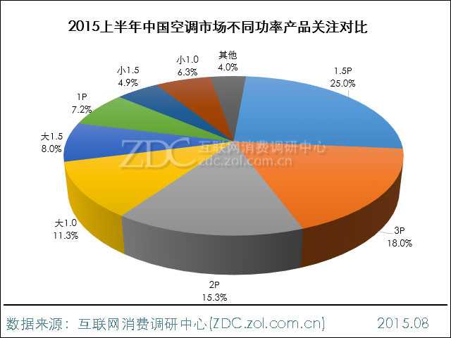 从功率来看,适合普通家庭用的1.5P功率的空调产品获得25.0%的用户关注度,相对集中。其次为3P功率的产品,关注比例为18.0%。2P和大1.0P产品关注度也均在一成以上,分别为15.3%、11.3%。