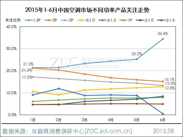 从1-6月走势来看,用户关注度相对集中的1.5P空调产品关注度呈稳步上升的走势,6月则出现9.2%的大幅度增长,关注度突破三成。