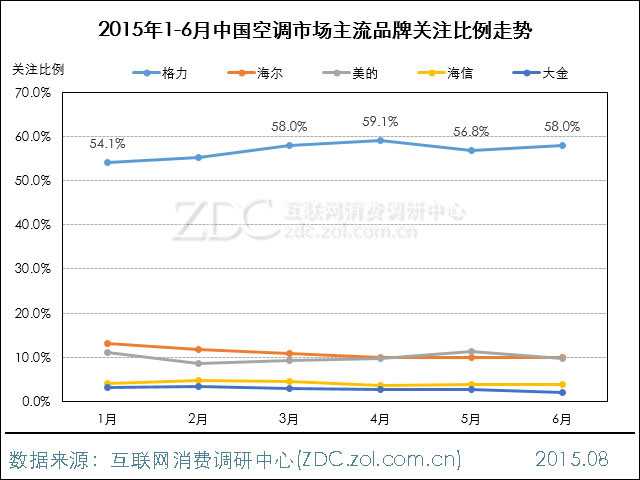 ZDC监测数据显示,2015年1-6月中国空调市场上,格力关注度呈先升后降的走势,6月小幅回升,达到58.0%,较1月增长了近4个百分点。海尔、美的关注度竞争相对更加激烈,此起彼伏,关注度差距微小。