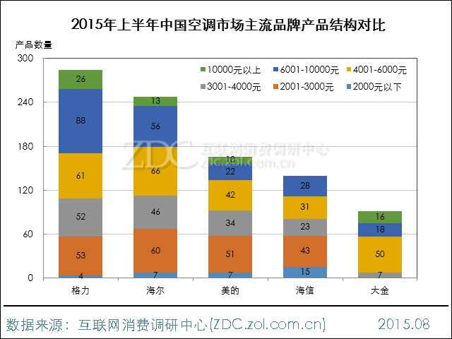 ZDC监测数据显示,2015上半年中国空调市场最受用户关注的五家品牌中,格力在售产品数量最多,达到284款。海尔在售产品数量也在200款以上。美的、海信产品数量分布在140-170款之间,大金产品数量相对较少,不足百款。