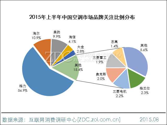 ZDC统计数据显示,2015年上半年,中国空调市场上格力以56.9%的关注比例高居榜首,遥遥领先于其他品牌。海尔以10.9%的关注比例居亚军位。美的则获得9.9%的关注比例,排在第三位。海信领跑第二阵营。