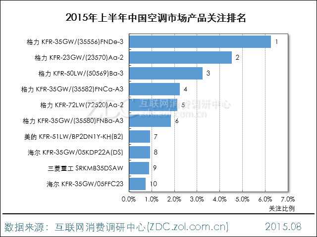 从产品关注来看,2015上半年格力 KFR-35GW/(35556)FNDe-3以6.1%的关注比例成为最受用户青睐的产品。整体来看,上榜的十款产品分别来自格力、美的、海尔、三菱重工四家品牌旗下,格力产品占据绝对优势,共六款入围。