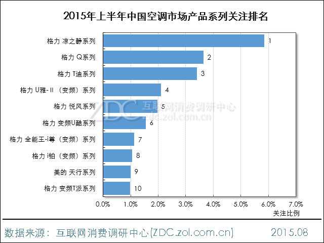 从产品系列来看,2015年上半年中国空调市场上,格力 凉之静系列以5.8%的关注比例高居榜首。格力Q系列、T迪系列分居第二、三位,二者关注比例差距不大。整体来看,上榜产品系列分别来自格力、美的两大品牌旗下,其中格力产品系列占据绝对优势地位,共有九个系列上榜。