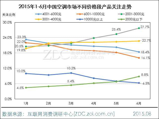 (图) 2015年1-6月中国空调市场不同价格段产品关注比例走势