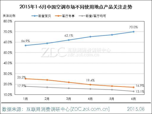 从1-6月走势来看,卧室专用空调关注度呈直线上升走势,6月其关注度达到70.0%,较1月增长13.1个百分点。其他两种产品关注度则呈稳步下滑走势。