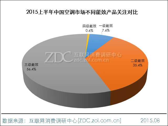 从能效等级来看,三级能效产品获得56.4%的关注比例,为用户关注的绝对主流,另外二级能效产品获得35.4%的关注比例。一级、四级能效产品关注度则相对较低。
