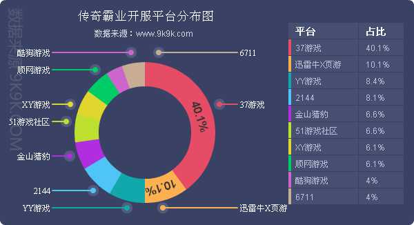 点评:本周《传奇霸业》开服在各平台的开服占比变化不大,新增分布比例的平台6711。