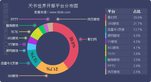 点评:本周《天书世界》本周开服在总量上有所减少,新增分布比例的平台602游戏、7k7k、酷狗游戏、风行游戏。