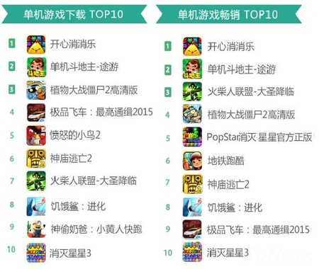 数据显示,本月单机游戏下载榜的前3名是《开心消消乐》、《单机斗地主-途游》、《植物大战僵尸2高清版》。而畅销榜前三稍有变化:《火柴人联盟-大圣降临》由第4升至第3。相比上月,单机游戏下载榜中《饥饿鲨:进化》前进一位。在单机游戏畅销榜Top10中,《神庙逃亡2》相较上月前进一位,升至第7。此外,继4月份上榜之后,《消灭星星3》再次杀进畅销榜前10。