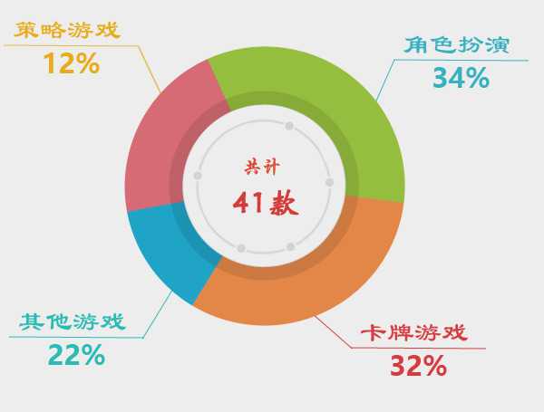 正值暑期档,手机游戏也迎来了新游发布热潮,近日,当乐游戏中心发布了15年7月手游数据, 7月新游发布量共计41款,环比增长37%,其中卡牌类产品劲升至32%,迎来反弹趋势,看来开发商们对于这类游戏的态度依然热衷。而角色扮演游戏自2014年底发力之后,整体走向平稳,本月达到34%的新游发布量,两者合计攻下整个手游市场的66%的份额,依然是当下市场的重要游戏类型。