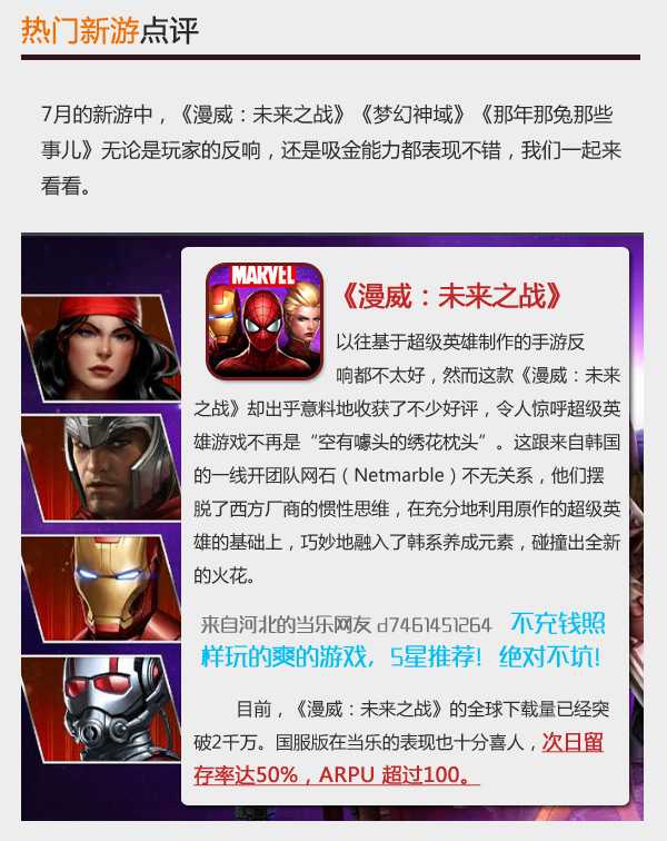 《漫威:未来之战》只看名字相信大部分人都会联想到与超级英雄有关,没错,这款游戏是以超级英雄漫画改编的手游,以往基于超级英雄制作的手游反响都不太好,而这款《漫威:未来之战》却出乎意料地收获玩家不少好评,这与来自韩国NO.1、全球TOP5的“恐龙级”移动游戏开发商网石(Netmarble games)的参与不无关系,他们摆脱了西方厂商的惯性思维,在充分地利用原作的超级英雄的基础上,巧妙地融入了韩系养成元素,碰撞出全新的火花。来自河北的当乐网友d7461451264如是说:“不充钱照样玩的爽的游戏,5星推荐!绝对不坑!”如此坚定的推荐,当然不会错,目前,《漫威:未来之战》的全球下载量已经突破2000万,国服版在当乐的表现也十分喜人,次日留存率达50%,ARPU超过100。