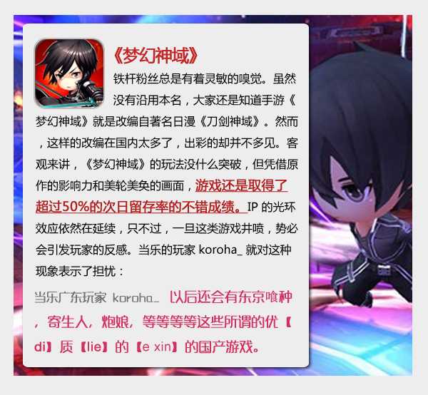 《梦幻神域》是首款由Unity3D打造神样战斗手游,改编自著名日漫《刀剑神域》。目前国内手游市场类似这样的改编类产品数不胜数,但是出彩的却并不多见。客观来看,《梦幻神域》在玩法上没什么突破,但凭借原作的影响力和美轮美奂的画面,游戏还是取得了超过50%的次日留存率,IP的光环效应依然在延续,只不过,一旦这类游戏井喷,势必会引发玩家的反感。