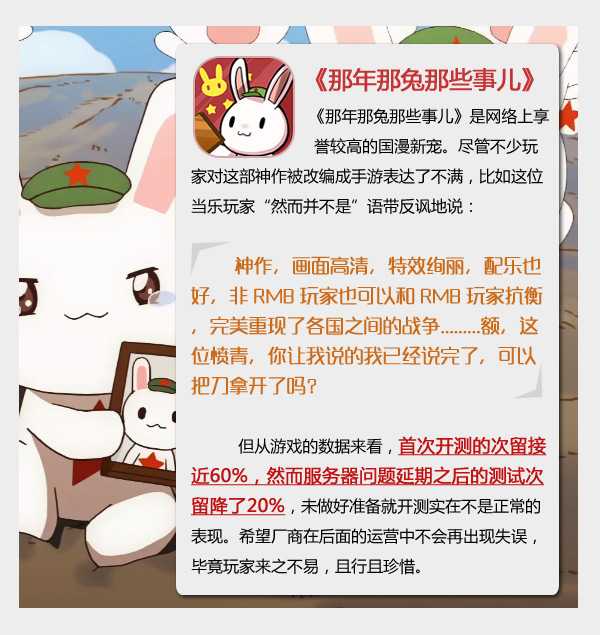 《那年那兔那些事儿》是网络上享誉较高的国漫新宠,尽管不少玩家对这部神作被改编成手游表达了不满,但从游戏的数据来看,首次开测的次日留存率接近60%,然而服务器问题延期之后的测试,次日留存率降了20%,游戏在未做好准备就开测实在有损品质,希望厂商在后面的运营中不会再出现失误,毕竟玩家来之不易,且行且珍惜。