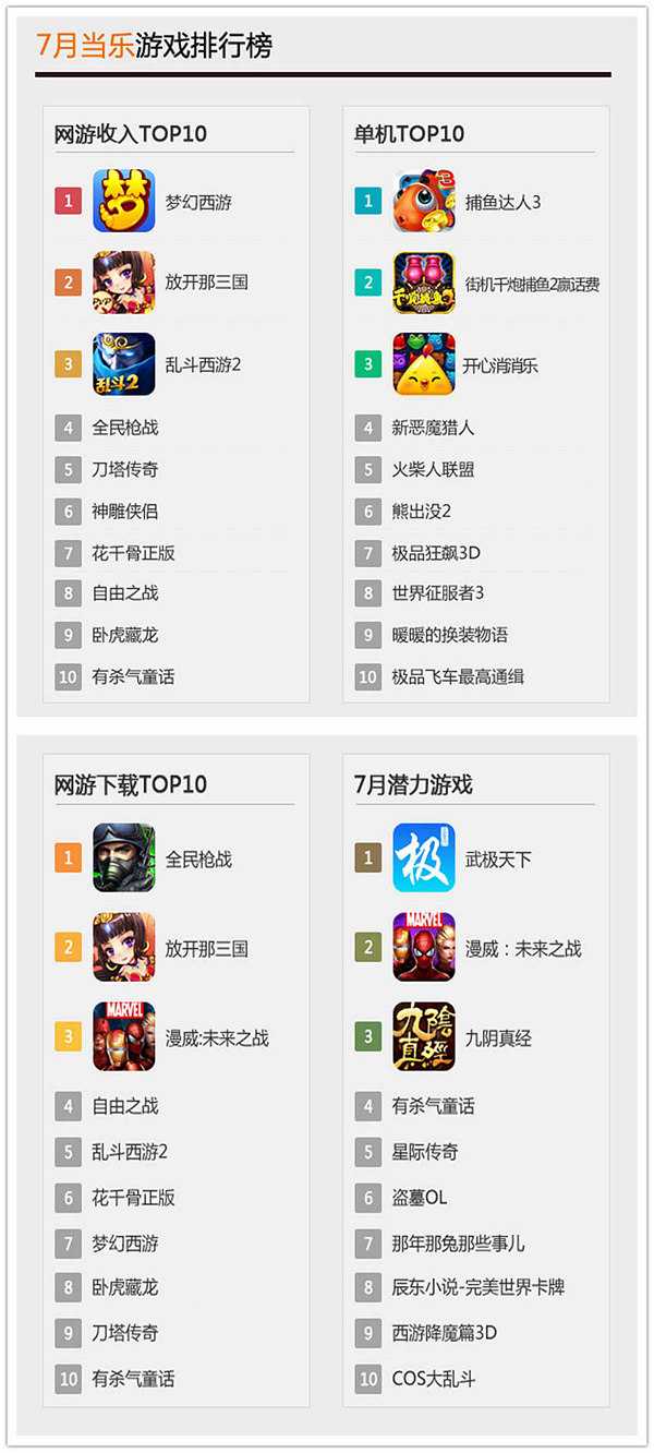7月手游成绩榜中《梦幻西游》依然牢牢守住网游收入榜榜首,这是既4月份以来该游戏连续4个月登录第一的位置,上月列数第二位的《放开那三国》也依然保持在本月第二的位置,看来这两款游戏表现十分稳定。虽然7月新游发布量有所上升,但新一轮手游的潜力股中排名靠前的并不多,看来厂商真的需要好好琢磨一下现在玩家的喜好咯。