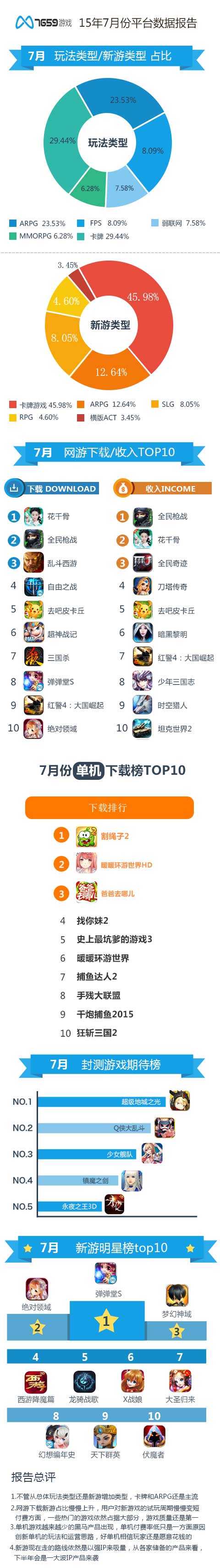2015年7月7659游戏数据报告:卡牌和ARPG仍是主流 7659游戏发布了2015年7月份平台数据报告,报告通过对新游类型、玩法类型、网游下载收入榜单等数据进行分析,同时列出了7月份的新游明星前十名和最受期待的游戏。 更多阅读:百度多酷:2014年1月游戏数据报告同步游戏中心:2015年2月游戏数据报告2015年2季度咪咕电视游戏数据报告Simon Priest:Will Harbin称创造性比数据分析更重要应用汇:2015年Q2游戏数据报告4问题告诉你 游戏数据分析师究竟是什么?手游运营:游戏数据怎样用才能“掌控全局”? 2014年Q2应用汇游戏数据报告Steam:全球游戏数据分析-中国单机游戏在趋于正版化DataEye:2015年Q3 HTML5游戏数据报告游戏运营杂谈之怎么做一份数据日报2015年4月同步游戏数据报告2915年3月份Twitch前20款热门游戏数据分析“游戏”数据小沃科技:2016年3月游戏数据榜单报告