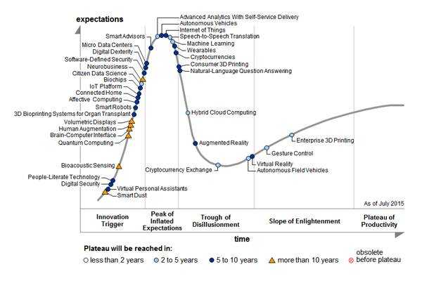 跟去年相比,自动汽车技术是今年最大的变化之一。随着 Google、苹果等技术巨头相继推进自己的自动汽车计划以及众多汽车厂商将之纳入自己的近期路线图,去年处在巅峰前期的自动汽车技术今年被炒作到了顶峰。类似地,在层出不穷的智能家居解决方案的推动下,物联网技术也进入到了炒作的高峰。