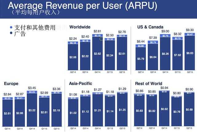 尽管尚未进入中国,但Facebook在亚太地区的ARPU数据值得关注。目前,这一数字仅为略高于1美元。作为对比,微信的ARPU已达到约7美元,与Facebook在美国和加拿大的情况相仿,而微信采用了与Facebook全然不同的商业模式。