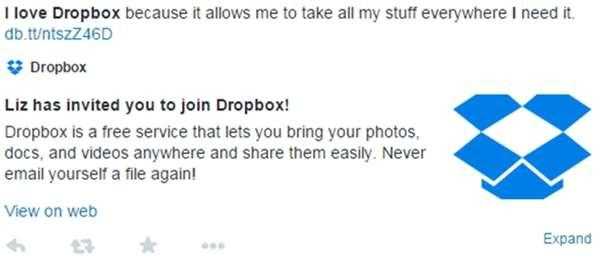 比如Dropbox会鼓励用户在推特上发布他们喜欢这项服务的原因,相应地,用户会获得额外的存储空间作为回报。一旦你把Dropbox和你的推特账号绑定,它就会分享一条这样的推特: