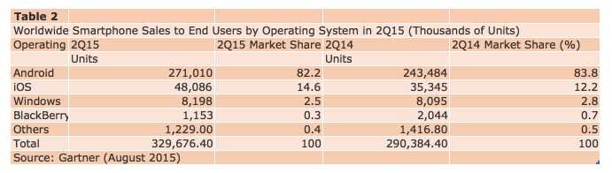 “Android系统2015年二季度创下了同比增长11%的最低纪录,其市场占比约为82.2%”,Anshul Gupta同时指出,尽管微软一直努力靠WP手机挤占市场,但其仍旧处于最低点,“鉴于微软近期持续削减移动硬件业务成本,对其长远影响,我们仍需再观察”。但可以确认的一点是,由于Android系统整体门槛较低,因而从长远角度来看依旧“潜力十足”。