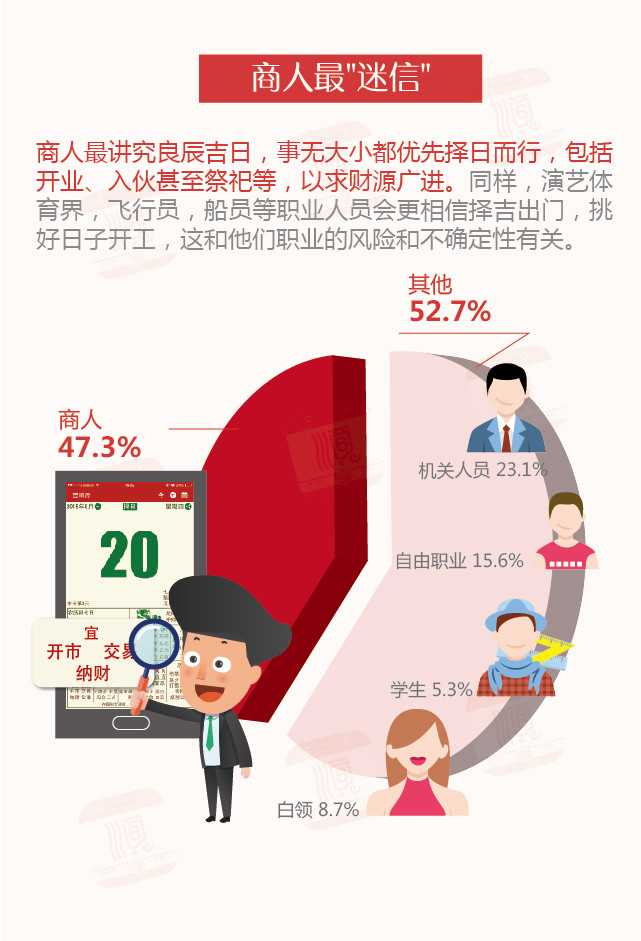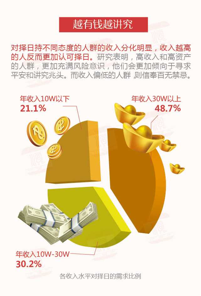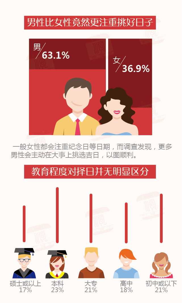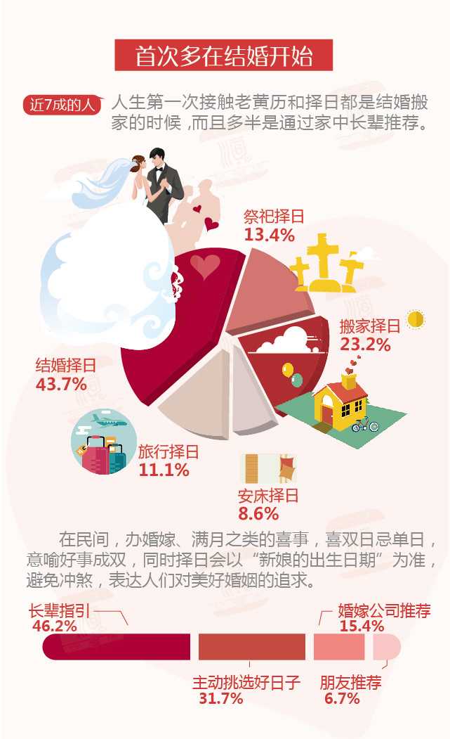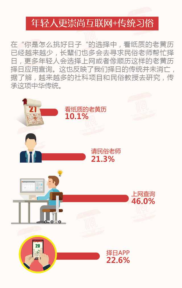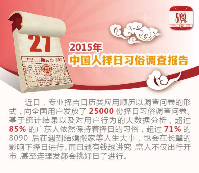 顺历:2015年中国择日习俗调查报告 其实据历书《夏小正》记载,自夏朝起,中国人民间办大事就讲究要选个良辰吉日,以趋吉避凶。如今国人择日择吉的习惯观念发生了怎样的变化呢? 更多阅读:凯络中国:中国女子力调查报告中国外文局:2014年中国国家形象全球调查报告2016中国高考状元调查报告:北京大学十连冠零点调查:2013年中国城市居民装修消费调查报告中国人口协会:2014年中国女士性福指数调查CBME:2015年中国孕婴童产业调查报告在中国,只抓一个权健是不够的长江商学院:2015年Q1中国产业经济调查报告云栖社区:2017中国开发者调查报告好订网:2018中国游客境外旅游调查报告2017年中国游客境外旅游调查报告2017中国消费者调查报告:“双击”中国消费者中国旅游研究院:2013年Q1中国游客满意度调查报告ZDC:2013年中国汽车维修及保养状况调查报告世纪佳缘:2012-2013年中国男女婚恋观调查报告