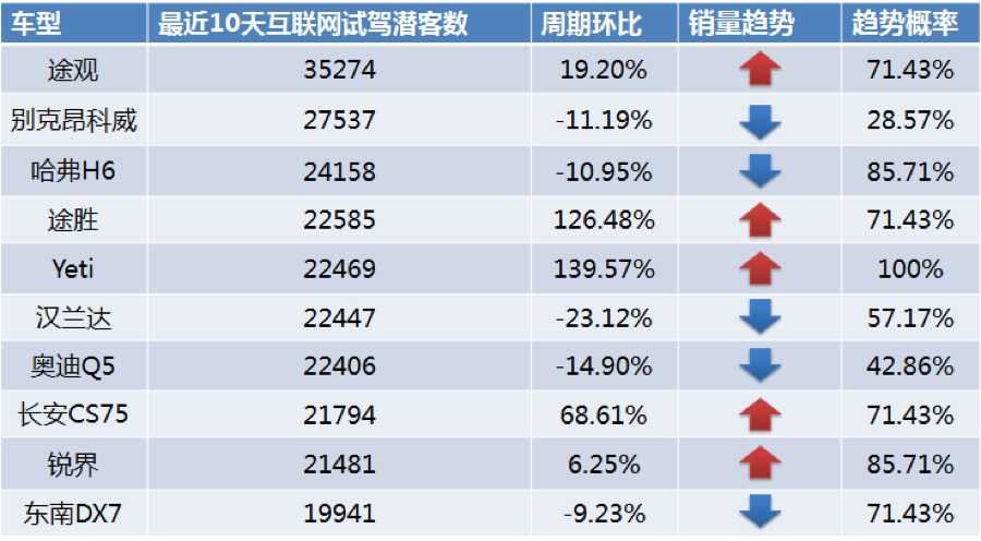 根据缔元信红渠汽车互联网营销数据库的试驾潜客数据,筛选出SUV、轿车和MPV下最近10天最受互联网购车用户关注的车型,并就这30款车型进行本周的销量趋势预测。